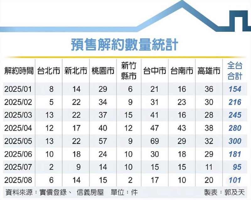 今年4、5月間因股市大跌而出現的預售屋解約潮,當時全台預售屋單月解約量高達300件,不過隨台股增溫、寫下歷史新高,預售屋解約壓力也隨之緩解,8月滑落至單月101件,較高峰時大減66%。