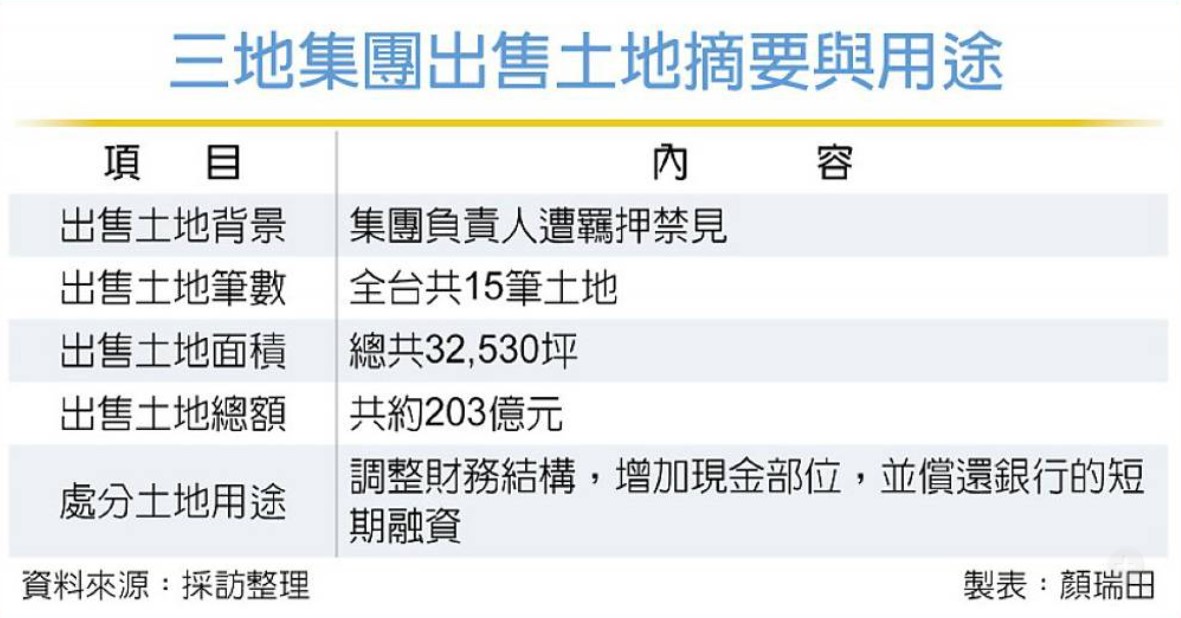 三地集團負責人鍾嘉村因案遭羈押,個人帳戶也被扣押,為籌措現金支應集團營運,市場傳出三地集團將處分全台15筆共32,530坪土地,開價總共超過200億元,三地集團副董事長李宗熹證實此事,表示欲藉此增加現金部位,償還銀行短期融資。