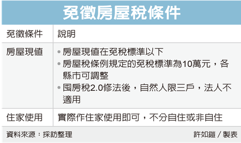 不過要留意的是,房屋稅差別稅率2.0(俗稱囤房稅2.0)已於今年元月修正公布,並自今年7月1日起上路,明年5月繳納房屋稅時適用,其中針對免稅房屋部分,適用對象改為自然人全國僅限三戶,法人則不適用這項免稅規定。