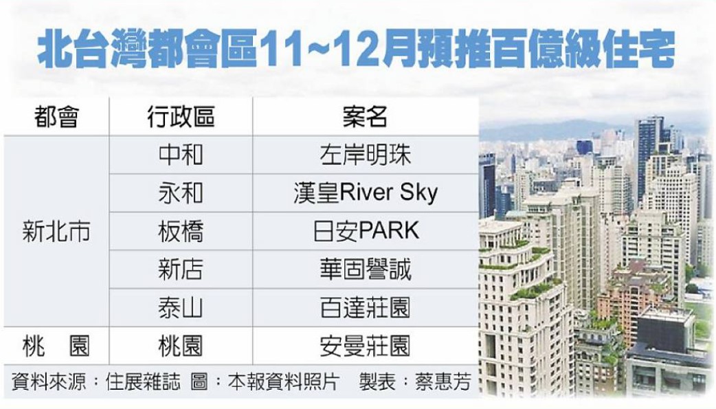 今年剩下最後一季,住展雜誌6日公布最新調查指出,北台灣預期11、12月,推出的住宅類破百億元指標案,驚見六大指標案醞釀登場,包括新北市中和「左岸明珠」、永和「漢,皇River Sky」、板橋「日安PARK」、新店「華固譽誠」、泰山「百達莊園」,及桃園「安曼莊園」,若如期推出,年尾房市可望「有出息」,北台灣全年推案量力守兆元大關。