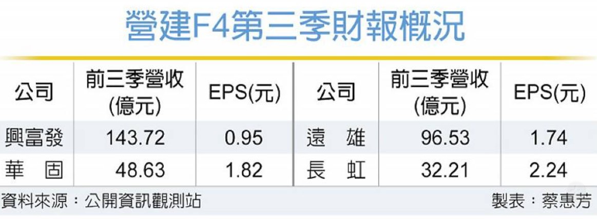 由於營建成本攀升、完工入帳遞延,加上限貸、關稅等政策及大環境變動影響銷售成績,營建F4興富發、華固、遠雄、長虹,前三季每股稅後純益(EPS)全數比去年同期衰退,分別下滑至0.95、1.82、1.74、2.24元。展望第四季,F4在建案完工入帳下,可望迎來年度最高峰,全年業績有機會重回正軌。
