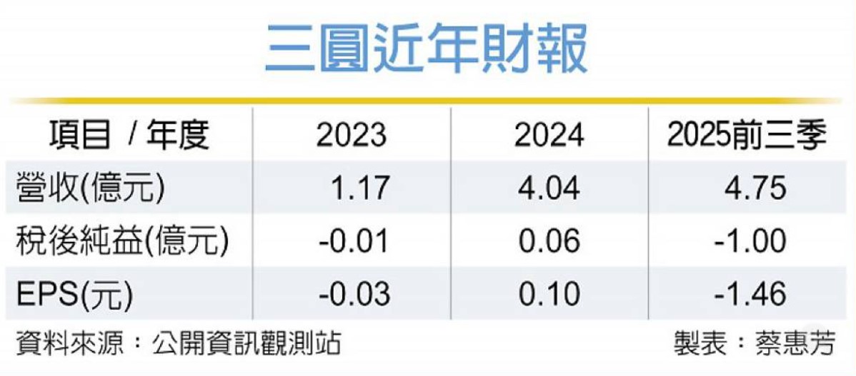 三圓今年前三季稅後純損1億元,每股稅後純損1.46元;Q4「台北之星」有1戶持續入帳,推升10月營收達3.03億元、年增達35.42倍。