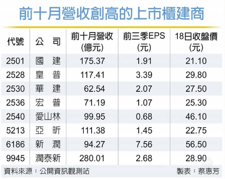 國建(2501)、皇普(2528)、華建(2530)、宏普(2536)、愛山林(2540)、亞昕(5213)、新潤(6186)、潤泰新(9945)等八家上市櫃建商,今年前十月營收均創同期新高,年底進入交屋入帳高峰期,營收喊衝,全年業績可望再寫新猷。