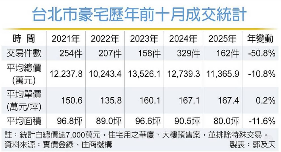 據實價登錄統計顯示,今年前十月台北市總價逾7,000萬元的預售豪宅共有162件交易,年減50.8%;平均總價約1.1億元,較去年同期修正約10.8%;豪宅平均單價在經過2022至2024年的急漲後,上漲動能趨緩,今年平均單價每坪167萬元,與去年相較波動不大;至於平均面積僅80坪,較過去多在90坪以上、甚至逼近百坪,不僅面積為近年來最小,更比過去縮水10~20坪。