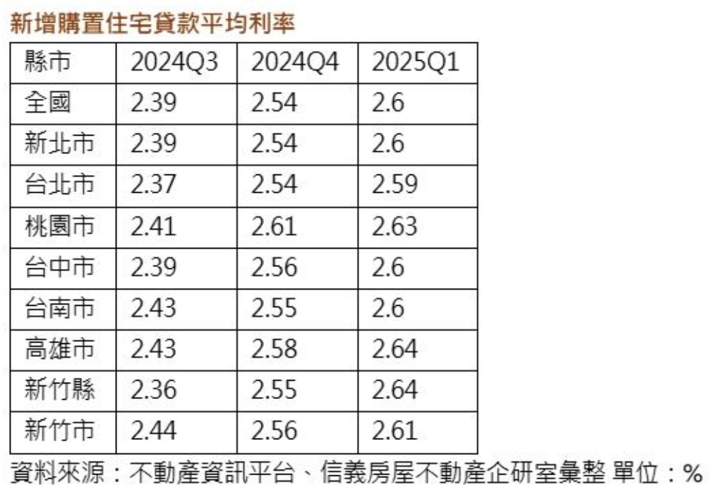 統計顯示,排除優惠房貸的一般房貸統計,連續升息前的房貸利率約為1.52~1.55%,連續升息後到2024第二季為2.36%,後面開始逐漸出現房貸排撥等亂象,再加上銀行自主管理與央行第七波管控,2024年第三季平均房貸利率2.39%,第四季就攀升到2.54%,今年第一季更進一步增加到2.6%,單純比較新增房貸的利率狀況,2.6%水準已經是金融海嘯後的單季新高,反映購屋的市場資金成本明顯增加。