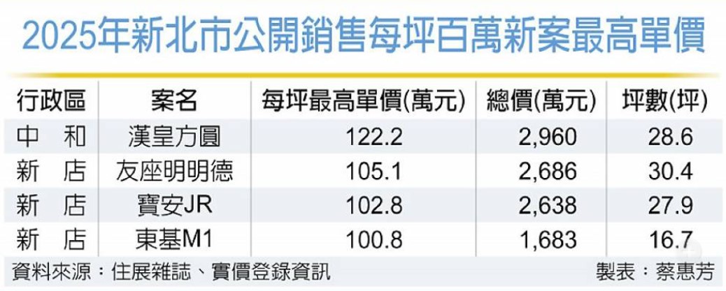 每坪百萬宅在雙北市遍地開花,台北市12行政區預售新屋成交單價最高都突破三位數,新北市也有中和、板橋、三重、永和、新店、新莊6區站上百萬大關,其中板橋每坪最高達125萬元,今年中和、新店區預售屋最高成交單價,也都跨過百萬門檻。
