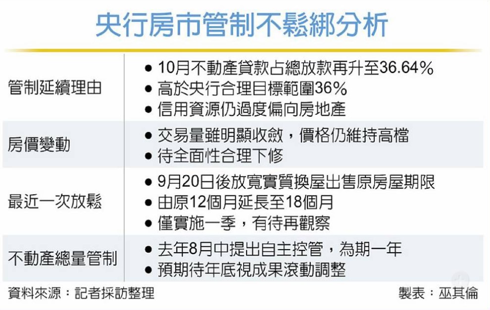央行第三季宣布9月20日後將實質換屋自住者之出售原有房屋期限,由原本12個月延長至18個月,被市場視為放寬,至今僅實施一季,以此判斷,管制措施料將延續。