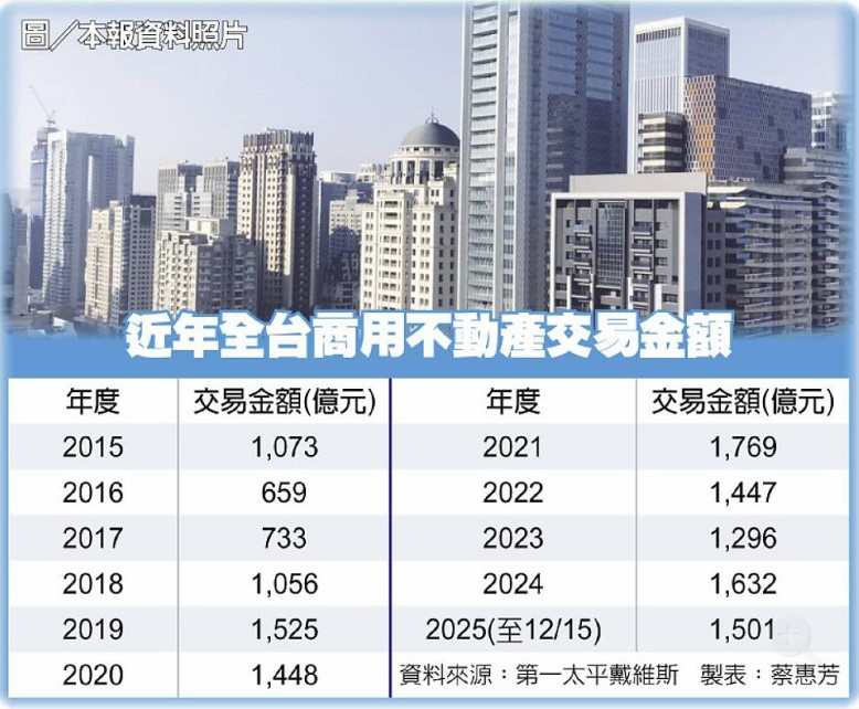第一太平戴維斯16日公布今年商用不動產市場季報指出,今年商用不動產在全球AI產業熱度不減下,成交金額超夯,儘管有美國對等關稅衝擊,但迄今全台成交金額仍達1,501億元,站穩10年均線1,306億元,表現穩健。