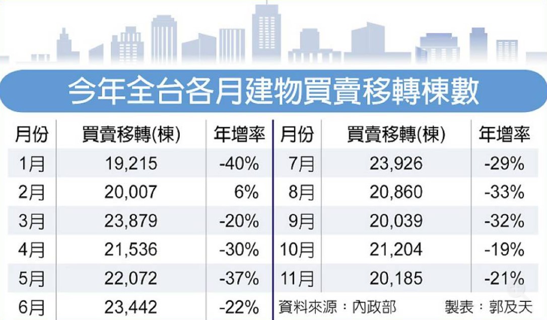 「金龍海嘯」掀起房市冰風暴持續,根據內政部統計,11月全台建物買賣移轉僅2.02萬棟、年減21.3%,2025年以來已連續11個月單月移轉量不及2.4萬棟,各縣市同步衰退,房市買氣之差歷年僅見。前11月移轉量23.6萬棟、年減26.8%,推估全年交易量將不到26萬棟,出現2017年以來最低量。
