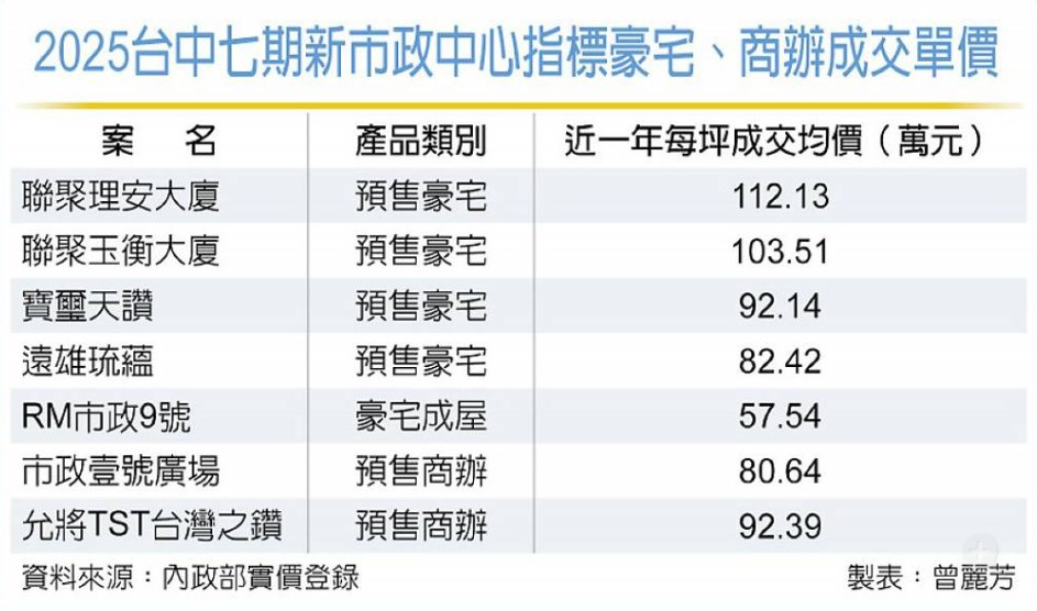 2025年台中七期房市,在高端住宅與商辦雙軌推升下,價格結構出現明顯分化。據實價登錄資料顯示,2025年七期預售豪宅最高每坪均價由「聯聚理安大廈」以112萬元刷新天花板,宣告七期預售豪宅跨入百萬單價時代;至於七期豪宅成屋市場,重啟銷售的「RM市政9號」近一年每坪成交均價僅5字頭,預售豪宅與成屋之間形成「價差斷層」。