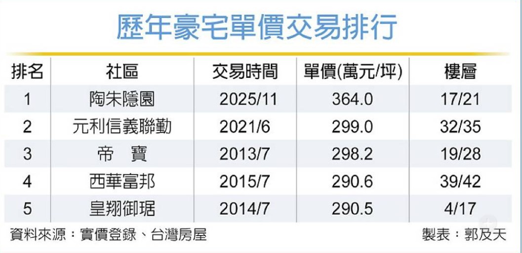 過去曾開出驚人價位的「陶朱隱園」,完工七年來首次出售給非關係人的市場交易,該戶買方為外籍的吳女士,單價一舉衝高至每坪364萬元,該案逾11億元的單戶總價,僅次於「文華苑」14樓的13.7億元。
