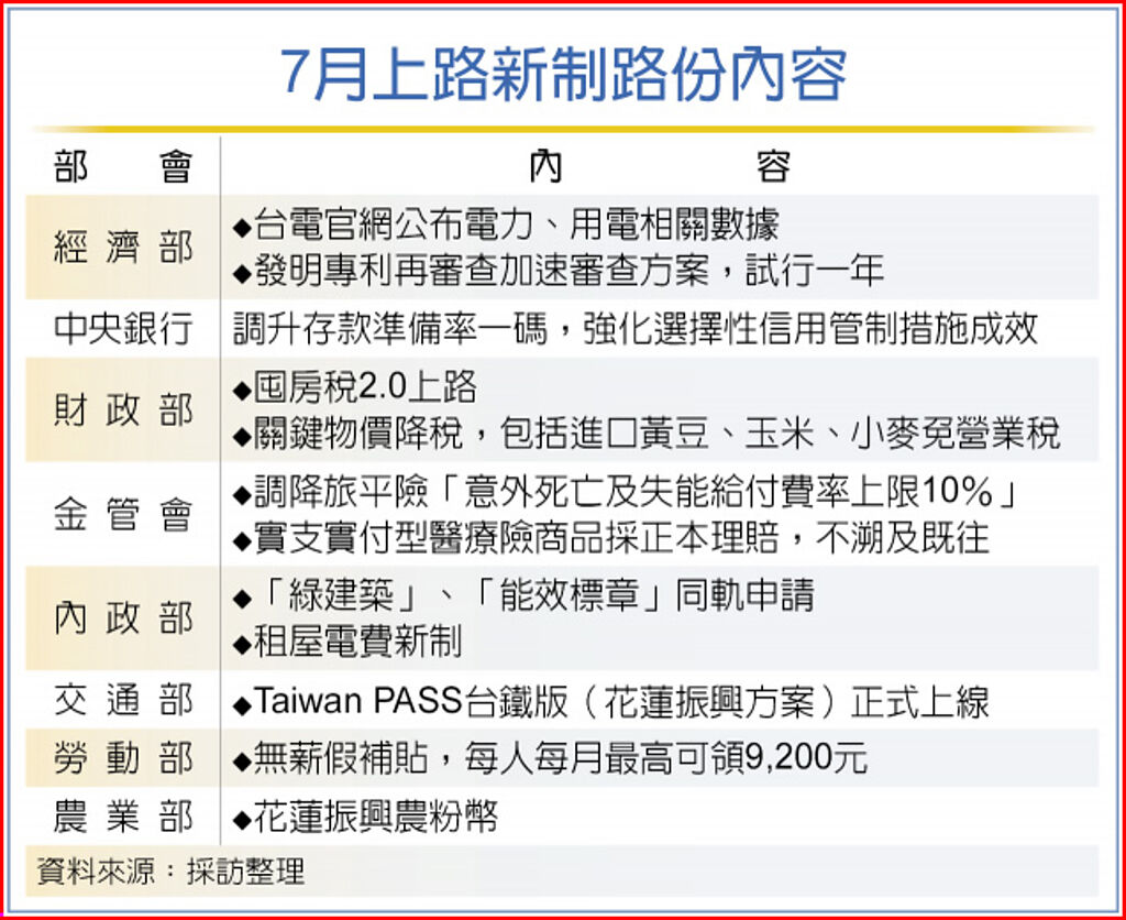 7月起多項新制上路,包括影響逾120萬戶納稅人的《囤房稅2.0》新制、穩定物價降稅措施,進口黃豆、小麥、玉米免營業稅、租屋電費設定上限的新制、以及實支實付型醫療險商品回歸損害填補原則,採正本理賠,且不溯及既往等。本報整理相關資訊如下。