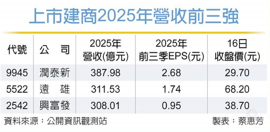受惠交屋潮來臨,三大上市建商潤泰新(9945)、遠雄(5522)、興富發(2542),2025年業績衝鋒,躋身「營收300億元」俱樂部。三雄持續受惠於建案交屋入帳,以及部分新案跨年度認列,市場樂觀2026年可望仍是個豐收年。