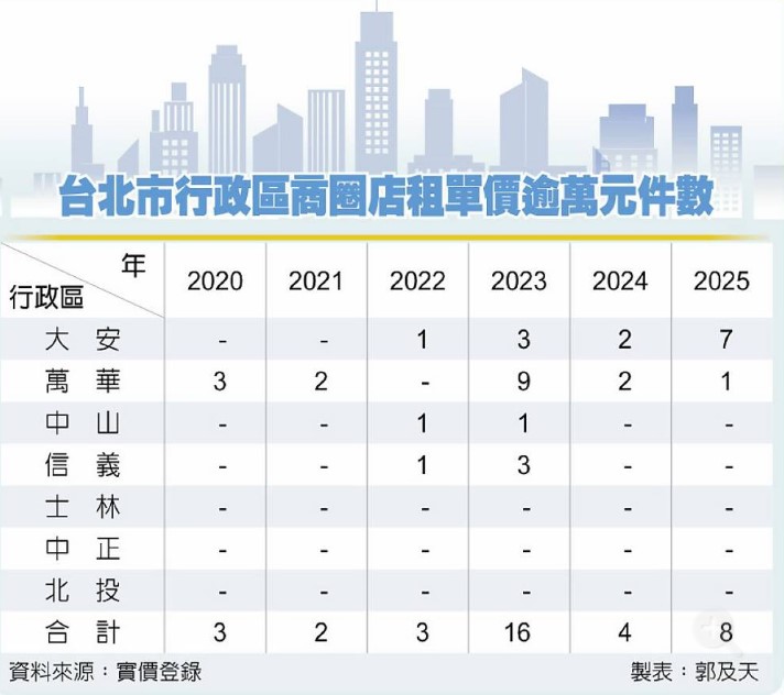 大巨蛋開幕人潮不斷,帶旺台北市東區商圈迎來復甦。根據實價登錄統計,2025年北市大安區就有7件租金單價逾萬元的店面租案,東區店面市場經歷長年低迷後,出現回溫跡象,不過其他核心商圈,如站前、士林夜市、石牌等,早年雖曾有最高租金單價破萬榮景,如今不再,黃金商圈版圖位移明顯