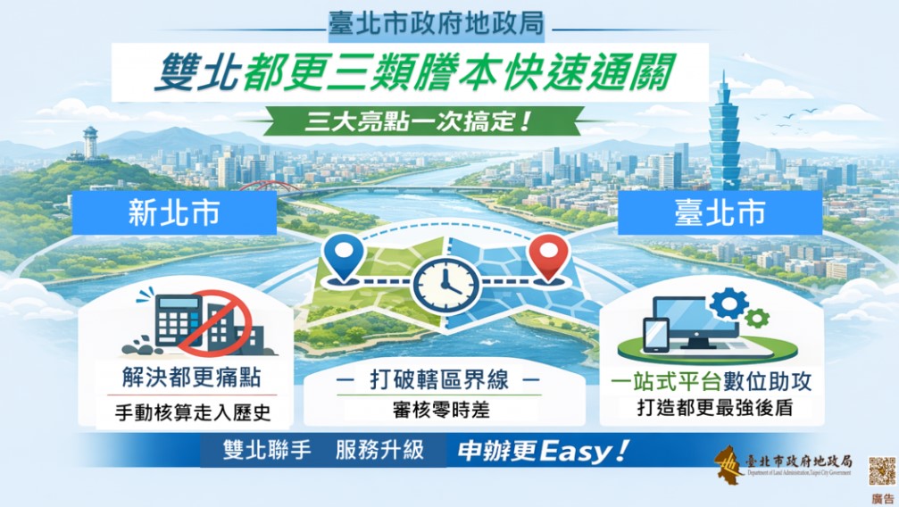 老屋重建行政流程曠日廢時,讓許多屋主卻不,為回應龐大的都市更新需求,台北市地政局2日宣布與新北市合作,未來在台北市申請新北市的「都市更新用第三類謄本」不必再人工審核,大幅縮短核發時間,快速通關。
