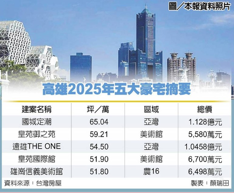 台灣房屋集團根據內政部實價資料統計,2025年高雄豪宅王,是「國城定潮」38樓戶每坪65.04萬元,其次是「皇苑御之苑」每坪59.21萬元,第三名是「遠雄THE ONE」每坪54.50萬元。