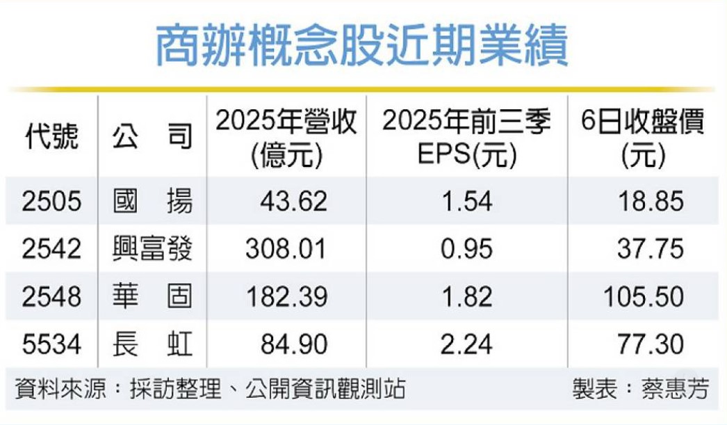 美國對等關稅不確定性因素消弭,景氣能見度可望較去年樂觀,商辦市場相對於去年也較明朗,1月以來銷售陸續開紅盤,國揚(2505)、興富發(2542)、華固(2548)、長虹(5534)等商辦概念股,今年都將迎來商辦和廠辦新案完工潮,收割契機也隨之看升。
