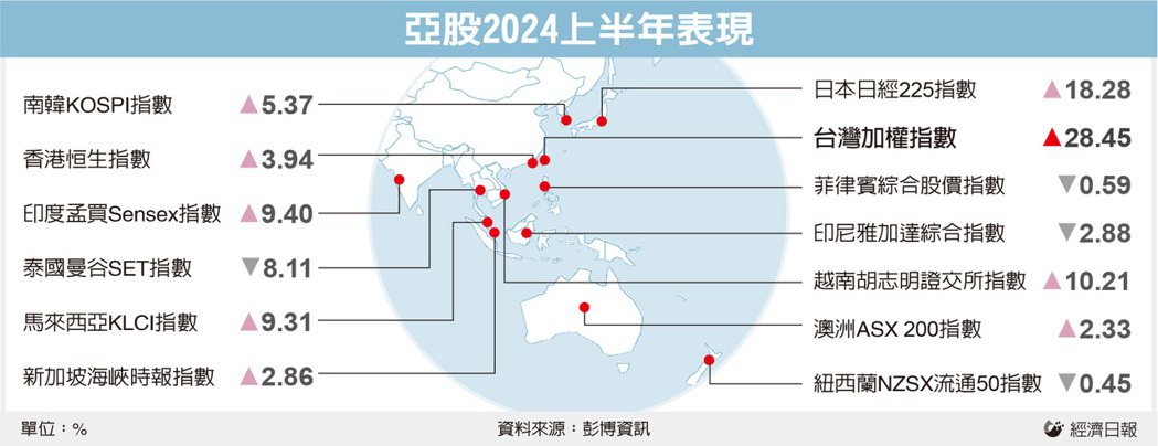大多數亞股今年上半年都收高,但泰國、印尼和菲律賓三地下跌;泰國SET指數上半年大跌8%,是亞洲區表現最差的主要指數。雅加達綜合指數下跌2.88%,菲律賓證券交易所指數下滑約0.6%。