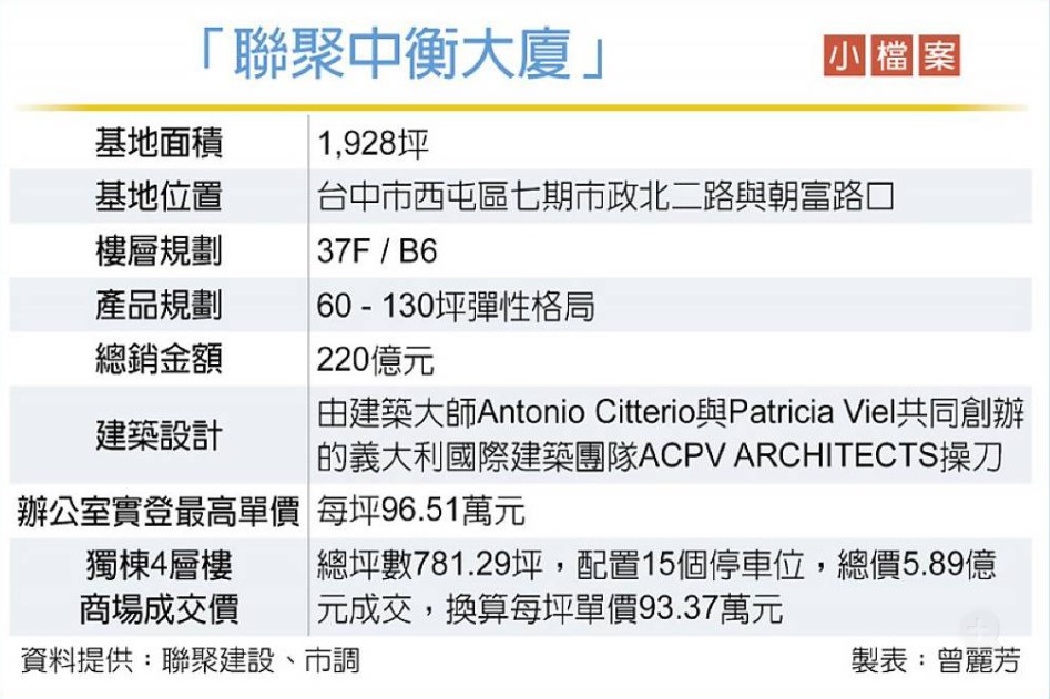 位於市政北二路與朝富路口的「聯聚中衡大廈」,規劃樓高37層,坪數60至130坪彈性配置,總銷金額上看220億元。自去年12月進場以來,已累積揭露25筆實價交易,其中包含1筆商場成交;辦公室產品最高單價達每坪96.51萬元,總價約1.21億元,已購客來自北部與中部的傳產業主不少。