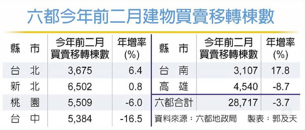 六都地政局買賣移轉棟數統計顯示,2月由於農曆春節因素,六都買賣移轉1.05萬棟、月減42.5%,創有統計以來單月第二低量。但以前二月合計來看,台南年增17.8%最高,雙北市也有個位數成長,不過台中市衰退16.5%,衰退幅度居六都之冠,各都移轉棟數呈現增減主要反映建案交屋量的變化。