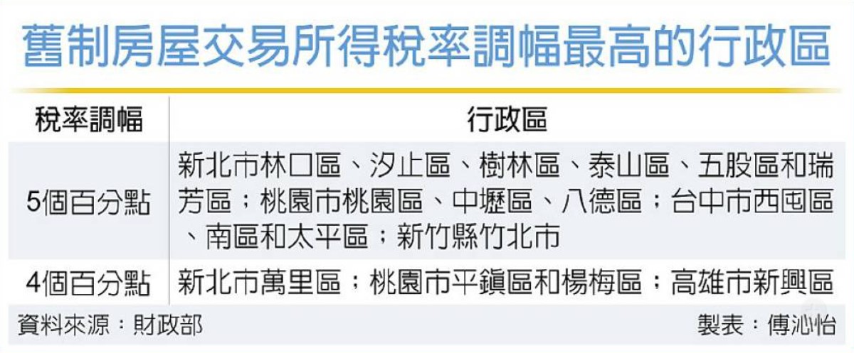 財政部4日公布114年度個人出售房屋的財交所得計算規定,提高舊制房屋交易的所得課稅標準,全台368個行政區中,有177個行政區被調高1到5個百分點,其中被調高5個百分點的行政區有13個,近半落在新北市。