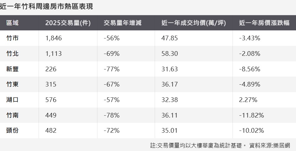 過去幾年在台積電效應帶動下,新竹及其周邊地區房價飆漲,竹北、湖口、竹南與頭份等地一度成為全台最討論度極高的科技房市熱區,然而在房市景氣轉弱、科技題材降溫與科技產業重心南移的多重影響下,這些區域明顯降溫;根據樂居網統計實價資料顯示,2025年竹科周邊主要房市熱區交易量較2024年大幅衰退,衰退幅度普遍達56%至78%,成交量幾乎腰斬甚至更慘。