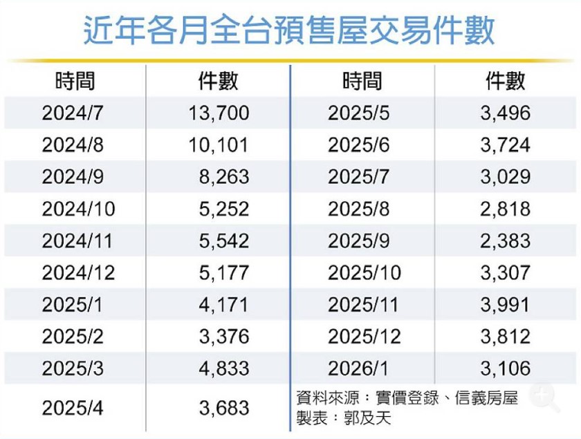 統計顯示,自2024年9月全台單月預售屋交易量跌破1萬件大關後,預售市場交易急凍,去年1月跌破5,000件,4月跌破4,000件,8、9月間甚至低至不到3,000件;不過去年10月起,已連續四個月站回3,000件之上。