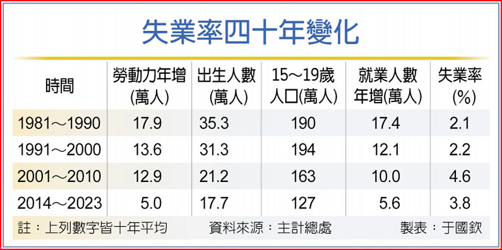 我們把過去四十年的人口、就業與失業資料分四期觀察,可以發現兩個現象:其一、第一個十年(1981~1990)出生人數平均每年達35萬,近十年(2014~2023)已降至17萬,減幅之大,各國少見。其二、第三個十年(2001~2010)就業平均每年仍增加10萬,近十年僅5萬,雖然就業成長減半,但失業率反而由4.6%降至3.8%,何以致之?少子化使然,這再次說明,少子化已顛覆了我們的傳統觀念,如今即使就業人口下滑,失業率也會降低。