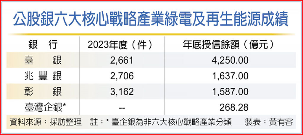 臺灣銀行指出,為響應政府綠色金融行動方案,積極辦理綠能相關融資,在六大核心戰略產業的綠電及再生能源,包括從事綠電及再生能源產業相關製造、電力及燃氣供應、營建工程、運輸及倉儲專業、科學及技術服務業等相關行業,截至去年授信總戶數為2,661戶,授信餘額達4,250億元;其中包括太陽光電18戶,授信餘額54.52億元,太陽能電池製造業6戶、授信餘額6.08億元,以及離岸風電2戶,授信餘額54.52億元。