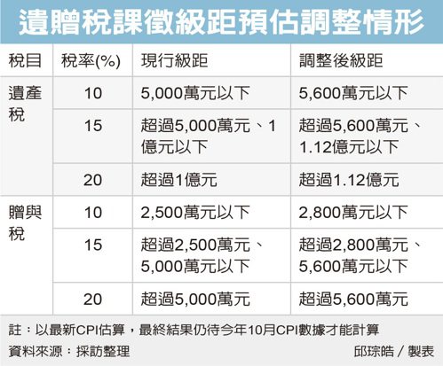 同樣依物價累計漲幅估算,贈與稅級距將調整為,贈與淨額2,800萬元以下,適用最低稅率10%;超過2,800萬元、5,600萬元以下部分,稅率15%;超過5,600萬元部分,稅率20%,但最終結果仍待今年10月CPI數據才能計算。
