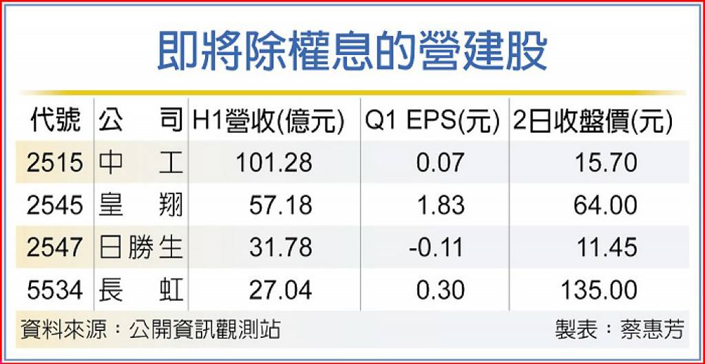 上周台股遇上黑色星期五,大跳水逾千點,營建股挾著下半年完工入帳高峰將來臨的業績題材,有望成為資金避風港。營建股的除權息旺季將登場,8月來說,雋揚(1439)將於7日除息0.3元,中工(2515)12日將除息0.52元,櫻花建(2539)除息0.4元,皇翔(2545)7日除息2.3元,日勝生(2547)15日除息0.25元,富華新(3056)15日除息0.41元,長虹(5534)22日除息5.5元,潤弘(2597)除權4元,其中中工、皇翔、日勝生、長虹,第四季完工交屋量將攀升,除息行情可望有亮點。
