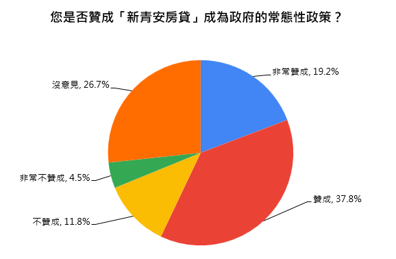 調查結果顯示,平均有66.2%民眾認為有助於減輕年輕人購屋負擔,其中南部地區認同度更高達71.6%;另有平均57.0%民眾希望政府將新青安列為常態性政策,其中更以20-30歲的民眾的64.6%為最高,突顯年輕世代對購屋補貼的強烈需求。