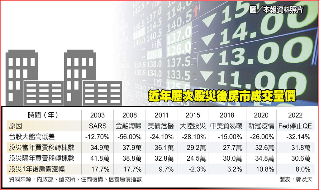 房仲業者觀察,過去20多年來台股股災對房市交易量的影響,2008年金融海嘯、2011年美債危機、2015年大陸股災及2022年Fed停止量化寬鬆(QE),當年度交易量較前年度下滑;而2011年、2015年、2022年的三次股災,隔年度交易量繼續萎縮。