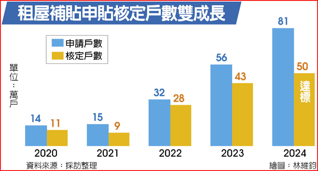 官員說明,此計畫一定會達標,除了規劃每年新增3.5萬戶社宅,包括直接興建社宅1.5萬戶及包租代管2萬戶外,在租屋補助方面,由於申請件數「爆量」超過81萬戶,核定件數逾52萬戶、達成50萬戶的目標,因此擬透過新版的專案補貼計畫,進一步加碼至75萬戶。