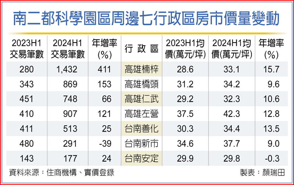 台積電所到之處,房市無不火熱,台南科學園區、高雄楠梓科學園區周邊七個行政區,除台南新市和安定,其餘五區今年上半年房市都價量齊揚,以高雄楠梓區最突出,預售成交單價一年上漲15.7%,預售案交易量更飆漲逾4倍,漲幅與交易量都稱冠。