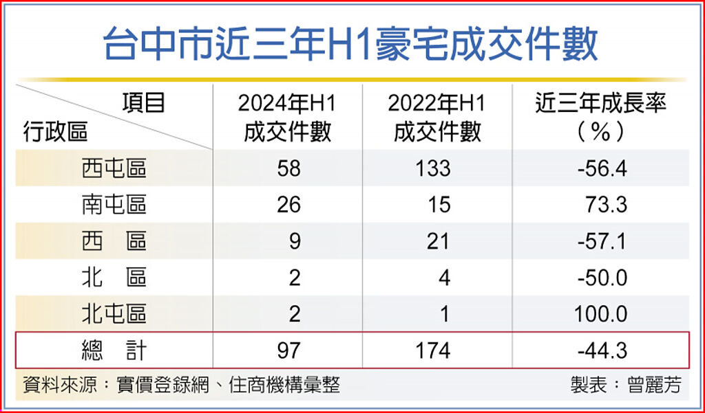 住商機構根據實價登錄資料,統計台中市4,000萬元以上住宅用華廈或大樓交易案件,其中,疫情期間房市多頭的最高峰是2022年上半年,全市約有174筆豪宅交易案件;不過僅時隔三年,今年上半年台中市豪宅交易案件卻下滑至97件,減幅高達44.3%。