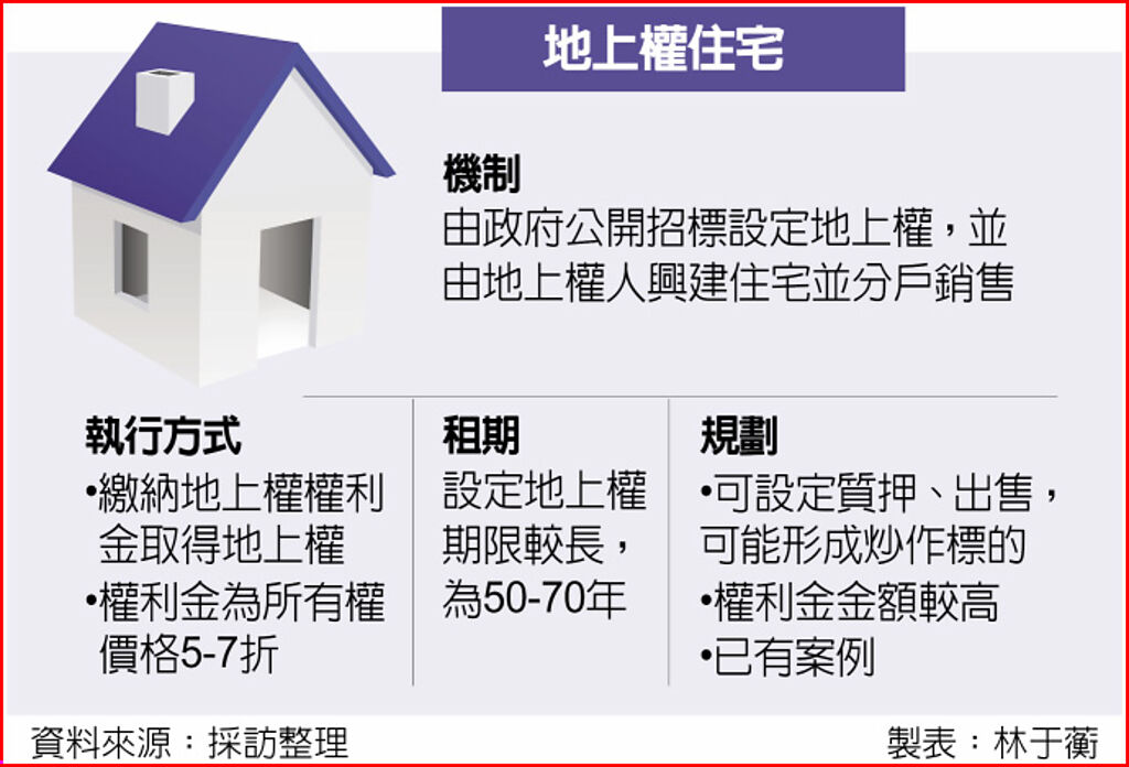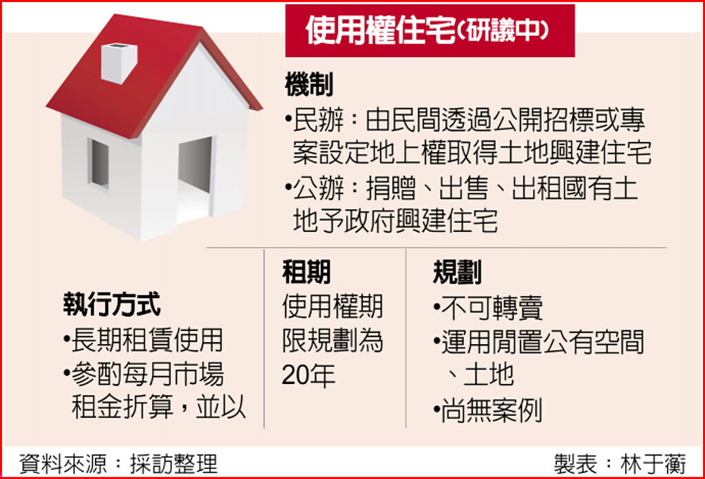 內政部說明,社會住宅因租期較短,租期三年可續租一次,主要是「渡橋」功能,為協助尚無合適居所者,透過渡橋轉為有房者。而考量地上權住宅期限較長、權利金較高,且可質押、出售,易成炒作標的;因此,正研議透過「使用權社宅」方案運用現有閒置公有空間,因土地和房屋為政府所有,可避免出售炒作,也可提供安定居住。