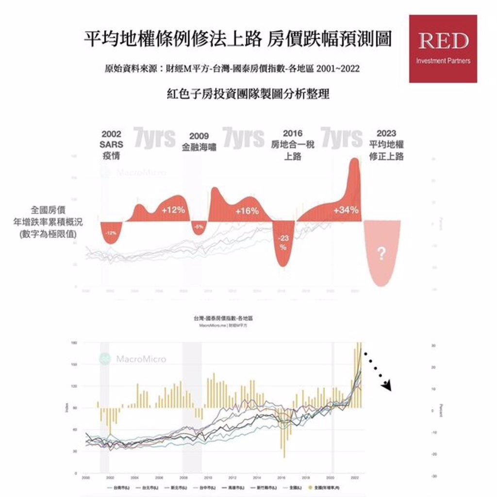 台灣房市雖已走了20年大多頭,但之中還是有漲跌波段,紅色子房瑞德資本團隊彙整調查新推案價量的國泰房地產指數發現,台灣房價有「7年下跌魔咒」,並在去年初觀察到2023年應是「下跌元年」,但新青安優惠房貸政策衝出買氣,似乎打破了循環魔咒。