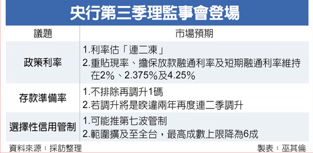 美國聯準會(Fed)台北時間19日凌晨公布利率決策,我中央銀行也在下午2點舉行第三季理監事會議。市場預期,央行利率應是連二凍,會議重點聚焦房市議題,由於近期各項房市數據居高不下,第七波信用管制恐怕是箭在弦上,甚至再搭配調升存款準備率1碼,打出「組合拳」為房市對症下藥。