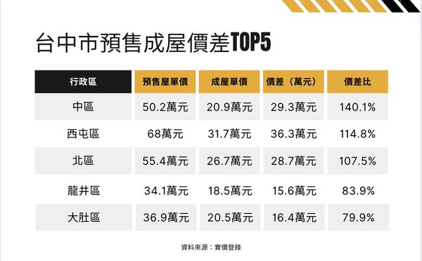 受惠於資金外溢與成本墊高效應,台中市成為全台房市的亮點。2023年主要行政區預售屋與成屋,中區價差高達140.1%,位居第一。西屯區、北區分別以114.8%與107.5%價差緊追在後。