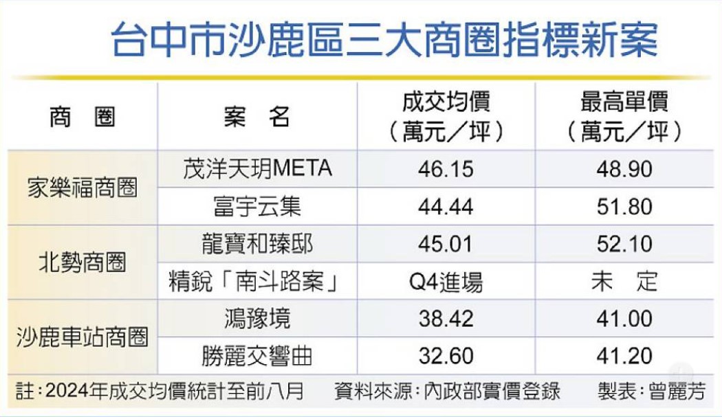 在地業者表示,沙鹿區內的家樂福商圈、北勢商圈及沙鹿火車站商圈,是目前建商主要布局熱點。其中位於家樂福商圈、捷運藍線B5站首排的「茂洋天玥META」,產品規劃23至35坪,實登揭露今年以來成交均價46.15萬元,最高單價48.9萬元;「富宇云集」產品規劃22至33坪,成交均價為44.44萬元,最高成交單價51.8萬元。