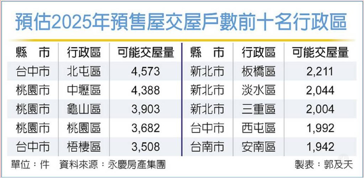 由於貸款成數降低,若以購屋族需額外自籌1成的購屋款推算,一些預售屋交屋熱區,如新北板橋、台中西屯,都需自籌200萬元以上,交屋量體最大的北屯、中壢,也分別需自籌178萬、139萬元。