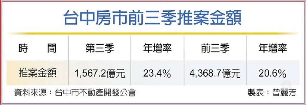值得一提的是,台中房市第三季推案金額達到1,567.2億元,年增23.4%;其中9月單月推案金額達752.2億元,年增81.3%,創下歷年單月新高。市場分析,主要是受民俗月、推案遞延等因素影響,造成9月推案金額大爆發。