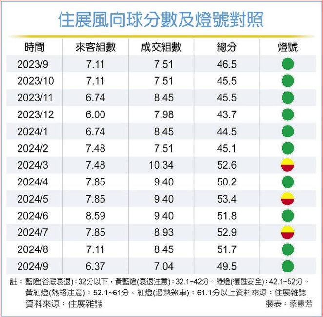 9月住展風向球17日出爐,分數跌落至49.5分,為今年3月以來首度跌破50分關卡。風向球六大構成項目呈現「一升、二平、三降」,新成屋戶數攀升,來客組數、成交組數、預售屋推案量下降,待售建案個數、議價率持平。