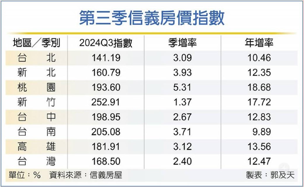 房價攀峰,第三季信義房價指數出爐,全台都會區指數為168.50,季增2.4%、年增12.47%,為去年第一季以來連續第七個季度上漲、連三季年增逾1成,七大都會區房價同創歷史新高。業者預期,第四季房價仍高檔難跌、不易大幅波動,打房效應需半年左右觀察。