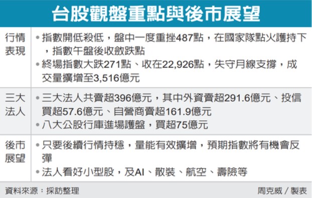 台股昨(29)日在外資大賣、市場賣壓出籠下,指數開低殺低,盤中一度重挫近500點,後在國家隊進場護持下,午盤跌幅收斂,終場跌271點、收在22,926點,失守月線。法人指出,由於目前指數已殺破政府基金23,000點的底線,預期在國家隊全力加持下,指數將有機會拚反彈。
