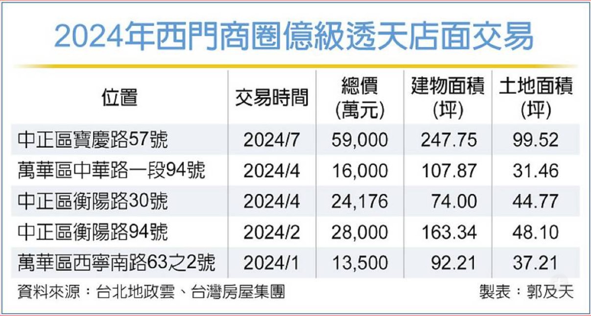 值得注意是,今年以來,西門商圈的整棟億級透天店面交易已有五件,累計交易金額破14億元,張旭嵐分析,台北車站仍然是台北的交通重要樞紐,結合台鐵、高鐵、捷運等三鐵共構,可說是人流轉運的必經之地,也帶動相鄰的衡陽路和西門町商圈觀光人潮。