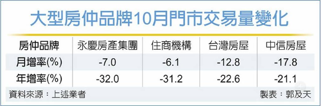 各大型房仲品牌統計10月交易量顯示,永慶房產集團月減7%、年減32%;住商機構月減6.1%、年減31.2%;台灣房屋月減12.8%、年減22.6%;中信房屋月減17.8%、年減21.1%。各大業者10月都呈年月雙減,反映自7月起房貸核撥趨緊縮、9月央行加碼信用管制措施,房仲業交易量明顯受衝擊。