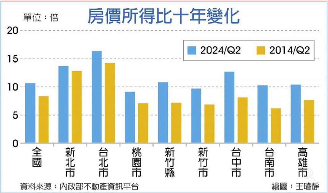 統計顯示,2014年第二季時全國房價所得比為8.34倍,而今年第二季已達10.65倍,等於十年間要多付出2.31年的家庭可支配所得,才能購得房屋。十年前分別為14.25、12.8倍的台北市、新北市,如今已擴增至16.36、13.71倍。