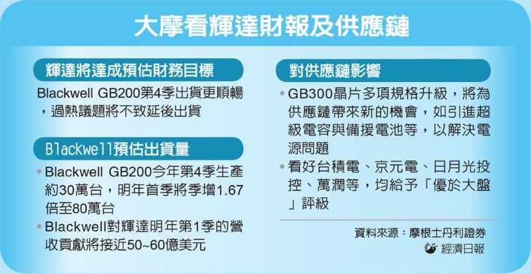 大摩半導體產業分析師詹家鴻認為,Blackwell GB200第4季出貨更順暢,將確保輝達能達成預估財報目標。